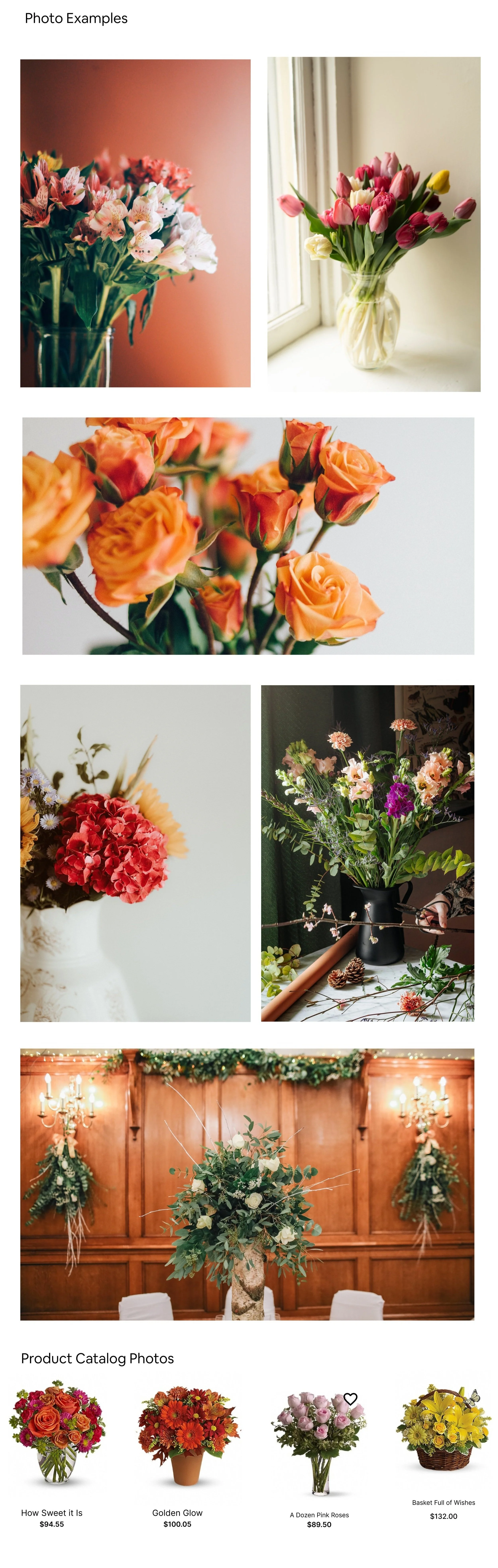 The Flower Exchange website’s initial look had an aesthetic that did not correlate well with its own personality. While putting together the mood boards and style tile, I crafted the visuals around a friendly and personable brand, by using a calm green for the navigation bar and accompanying warm colors throughout the design.