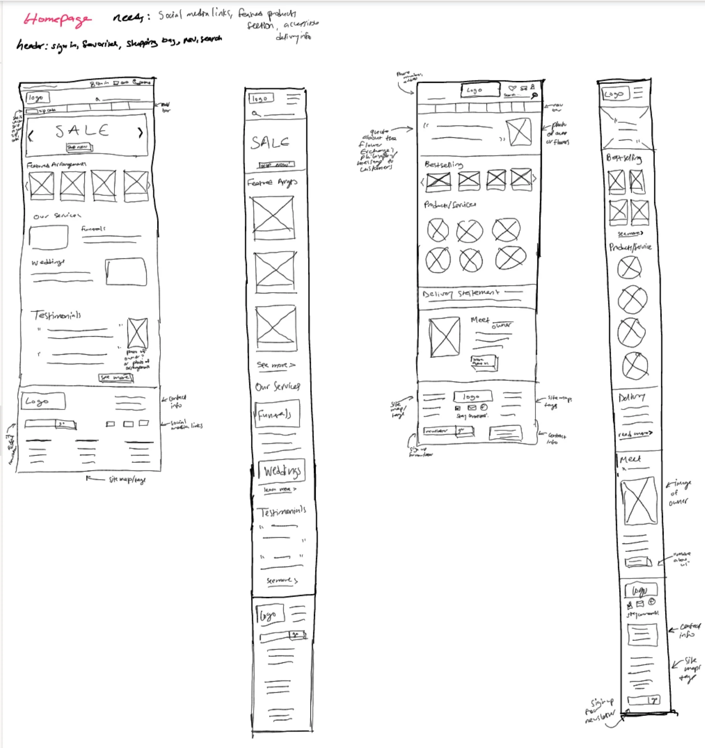 In these homepage sketches, I experimented with different layouts to best determine which information needed to be prioritized before I started digitizing the homepage.